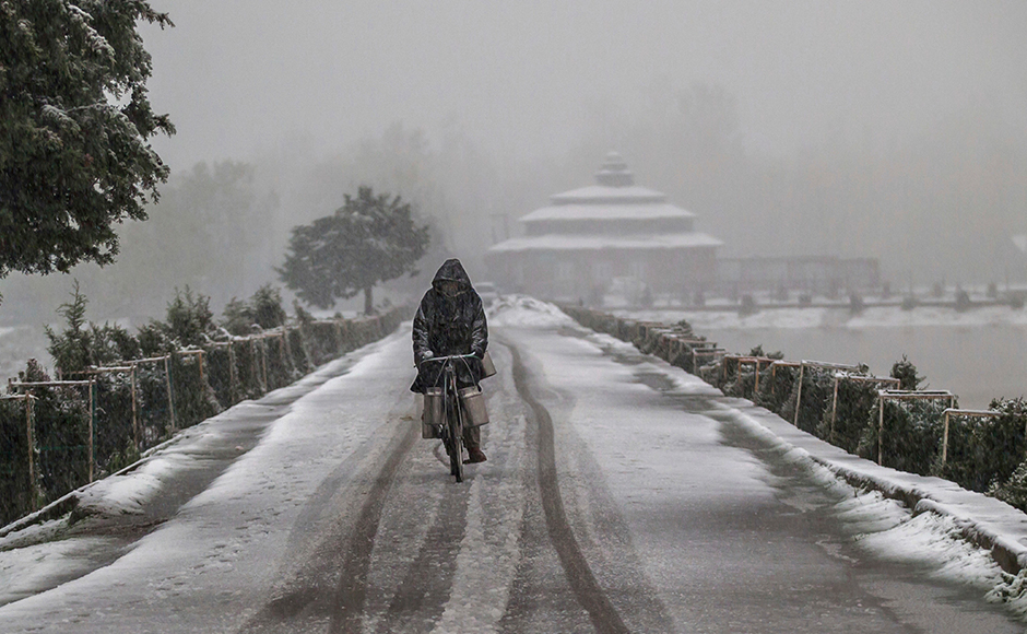 A Kashmiri milkman cycles on a snow-covered road on the outskirts of Srinagar, Indian-controlled Kashmir on Thursday. (AP Photo/Dar Yasin)