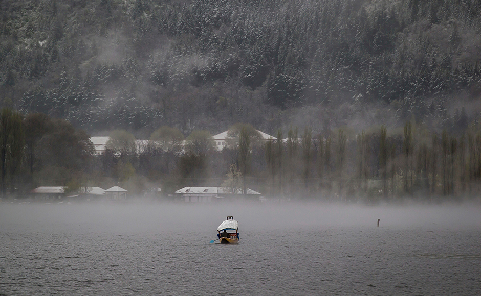A Kashmiri boatman paddles his shikara amid dense fog on Dal Lake after fresh snowfall in the outskirts of Srinagar, Indian-controlled Kashmir on Thursday. Heavy snowfall and rains have forced authorities in Kashmir to close schools and colleges even as the only all weather road link that connects the Kashmir valley to the rest of India has been cut off. (AP Photo/Dar Yasin)