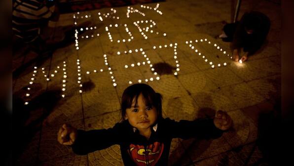 A Malaysian ethnic Chinese child reacts to the camera as others light candles during a vigil for missing Malaysia Airlines passengers at the Independence Square in Kuala Lumpur on March 10, 2014. Malaysia has expanded its search area for a missing jet after three days of scouring the sea failed to bring forth any confirmed sightings of wreckage, an official said. He added that besides searching in waters between Malaysia and Vietnam, authorities were also searching on land in Malaysia and off western Malaysia. AFP