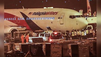 Ground crew check the Malaysia Airlines flight MH192 bound for Bangalore that turned back towards and parked at Kuala Lumpur International Airport in Sepang, Malaysia, after its right landing gear malfunctioned upon takeoff. The airline says Flight 192 carrying 166 people landed safely at the Kuala Lumpur International Airport early Monday, four hours after it departed. Vincent Thian/AP
