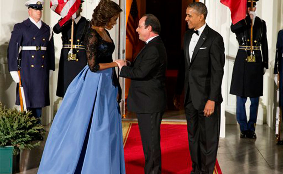 The gown featured a black, hand-sewn beaded embroidery applique scallop-edged top that came to the first lady’s elbows and covered her famously toned arms. The top went over a blue silk faille corset and long skirt with a train that billowed behind the first lady as she walked with President Obama: AP