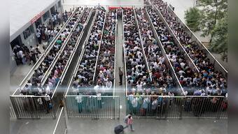 Passengers line up as they wait for a security check during morning rush hour at Tiantongyuan North Station in Beijing. Reuters