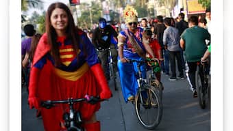 Residents wear costumes and ride bicycles as they celebrate Car Free Day in Mumbai on Sunday, 23, February, 2014. The event locally organised for the fourth consecutive year aims to cut down on pollution and give people an opportunity to enjoy a traffic free environment. Associated Press