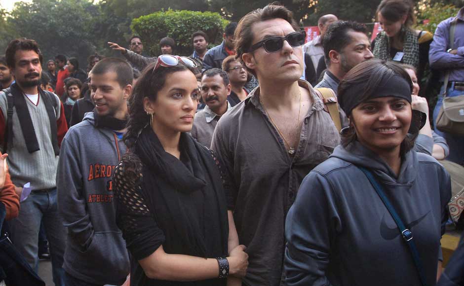 Sitarist Anoushka Shankar with her husband Joe Wright were present at at Jantar Mantar in New Delhi to back the protest against the SC verdict. PTI