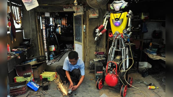 Chinese inventor Tao Xiangli welds a component of his self-made robot (back) at the yard of his house in Beijing, May 15, 2013. Tao, 37, spent about 150,000 yuan (USD 24,407 ) and more than 11 months to build the robot out of recycled scrap metals and electric wires that he bought from a second-hand market. The robot is 2.1-metre-tall and around 480 kilograms (529 lbs) in weight, local media reported. Picture taken May 15, 2013. REUTERS