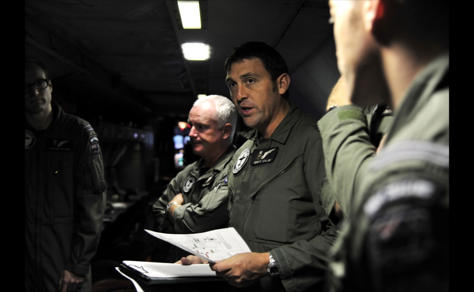 Flight Lieutenant Steven Graham (C) holds a briefing aboard a Royal New Zealand Air Force (RNZAF) P3 Orion maritime search aircraft as it flies over the southern Indian Ocean looking for debris from missing Malaysian Airlines flight MH370. Reuters
