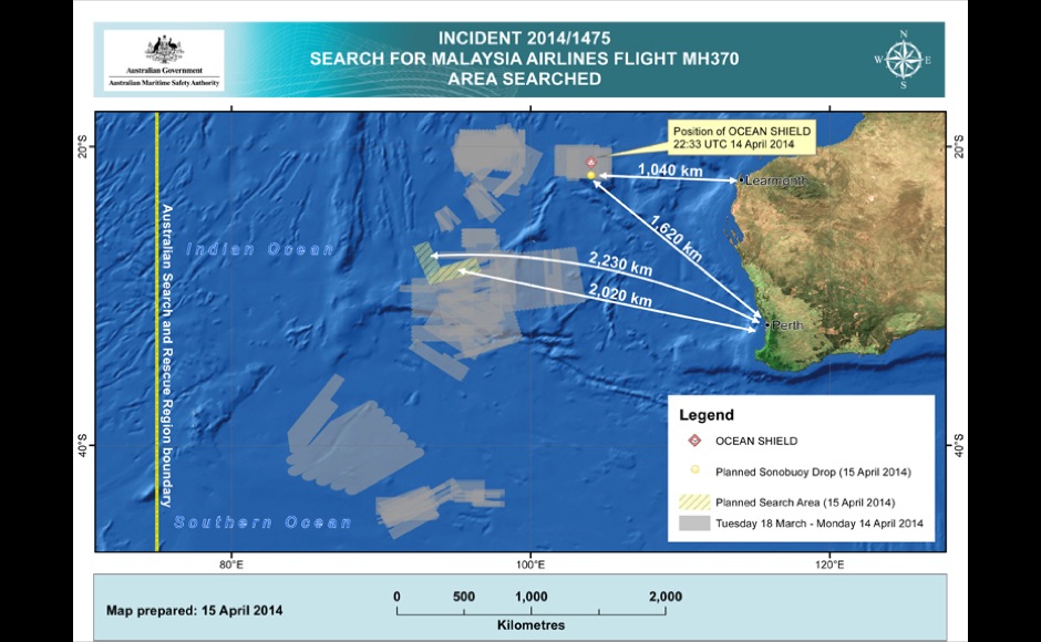 In this map provided on Tuesday, April 15, 2014, by the Joint Agency Coordination Centre details are presented in the search for the missing Malaysia Airlines Flight 370 in the southern Indian Ocean: AP