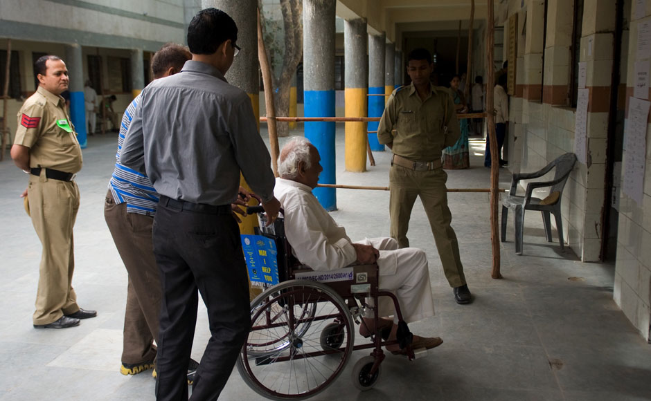 A senior citizen in a wheelchair is taken inside the polling booth to vote in Mehrauli. Naresh Sharma/ Firstpost