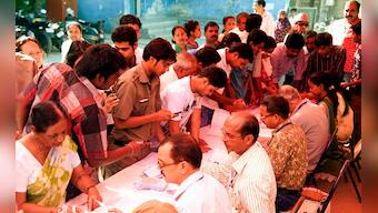 A senior citizen in a wheelchair is taken inside the polling booth to vote in Mehrauli. Naresh Sharma/ Firstpost