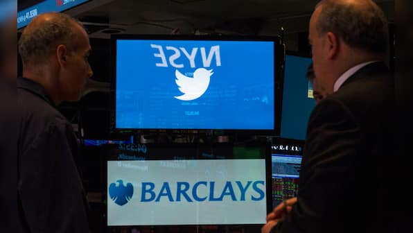 A sign displays the Twitter logo on the front of the New York Stock Exchange ahead of the company’s IPO in New York. Reuters