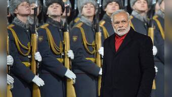 Prime Minister Narender Modi inspects a guard of honour on his arrival at Vnukovo-2 Airport in Moscow. PTI/Shahbaz Khan