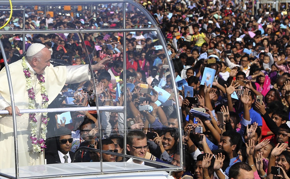 Pope Francis also led a giant mass in Dhaka and greeted faithful as he arrived in a pick-up truck covered with glass. AP