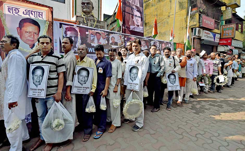 Veteran Congress leader and former Union Minister for Information and Broadcasting Priya Ranjan Dasmunsi passed away at 72 on Monday. The mortal remains of Dasmunsi being brought at Congress office Bidhan Bhawan for last respects, in Kolkata on Tuesday. PTI