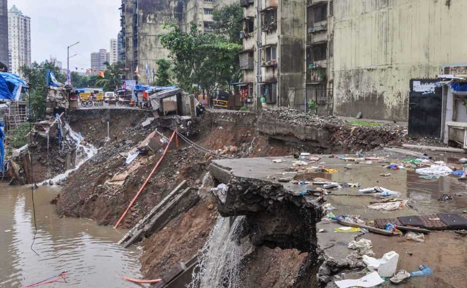 A road caved-in near a construction site in Chandivali’s Sangharsh Nagar. A wall collapse in Kalyan in Thane district early Tuesday killed three people, officials said. In Buldhana district, a 52-year-old woman was killed on the spot by a bolt of lightning. PTI