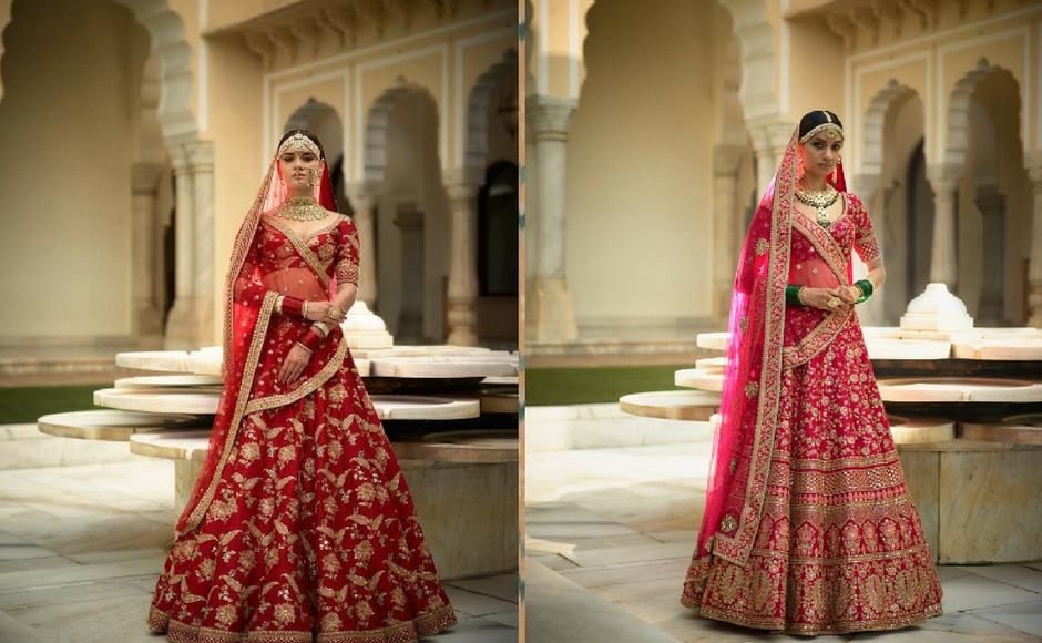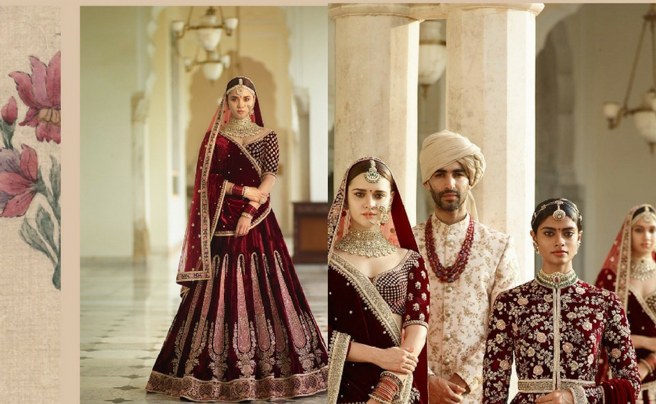 Sabyasachi says, ‘Deep reds, henna and browns, reminiscent of ‘The Indian Earth’ have a certain sense of dominance and power. ’ Silk, kanjeevaram, zardozi and gota form the basis of the bridalwear for the The Indian Earth collection. Image via Sabyasachi Mukherjee/Facebook