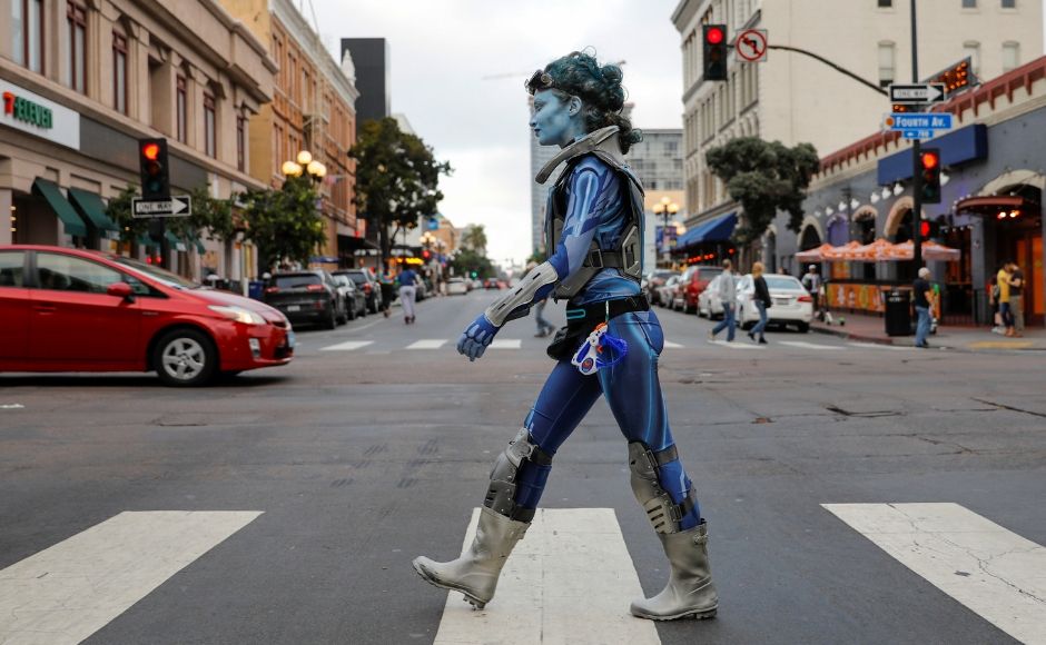A woman crosses the street in costume at the downtown intersection in San Diego on the evening of Day 1 of the Comic Con. Reuters/ Mike Blake
