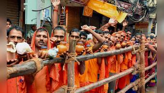 A devotee holds 'Gangajal' to perform 'Abhishek' of Lord Shiva at Kashi Vishwanath temple, on the occasion of Sawan Somvar in Varanasi. PTI