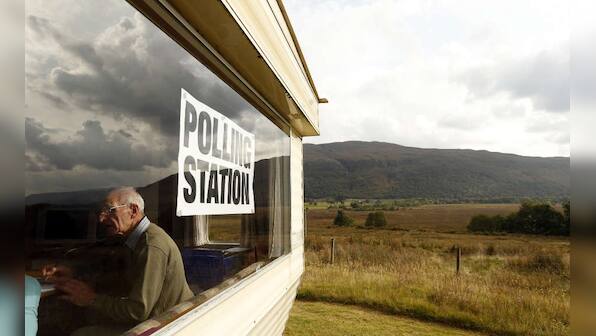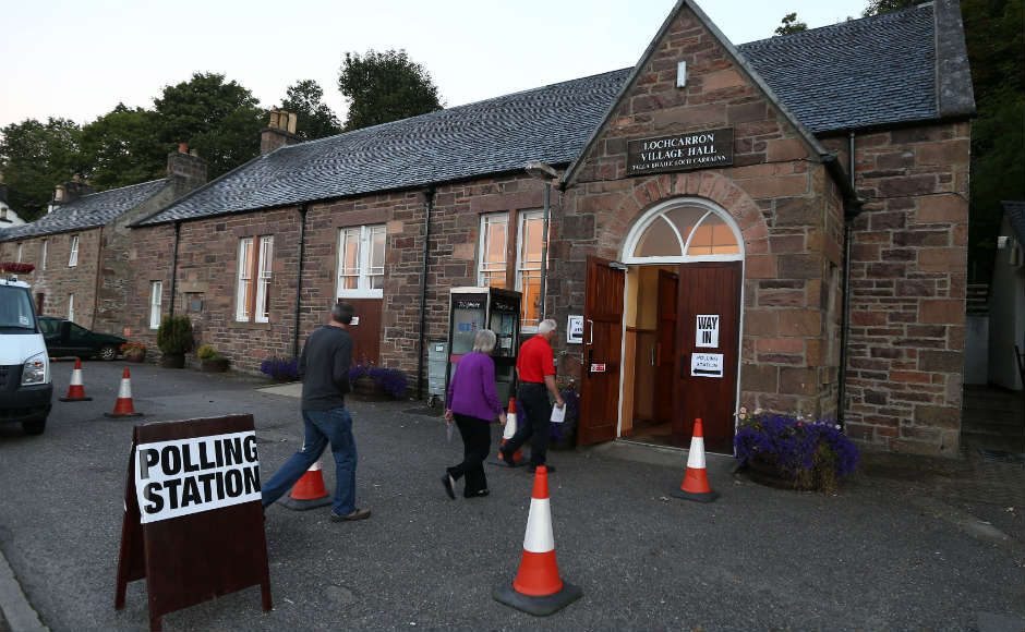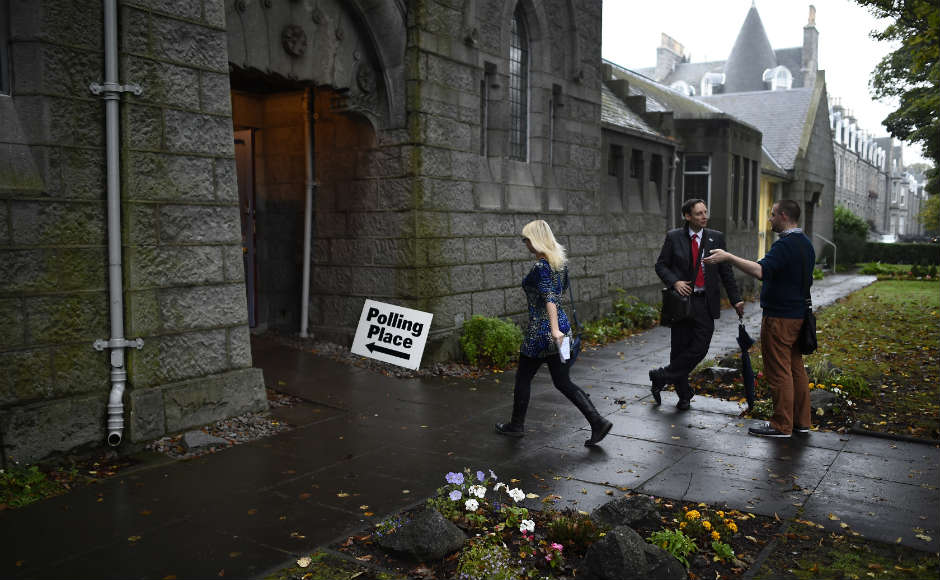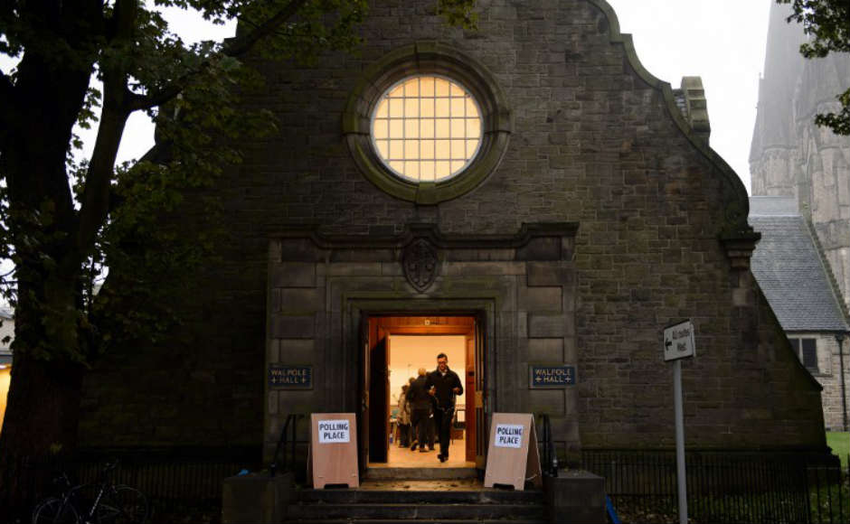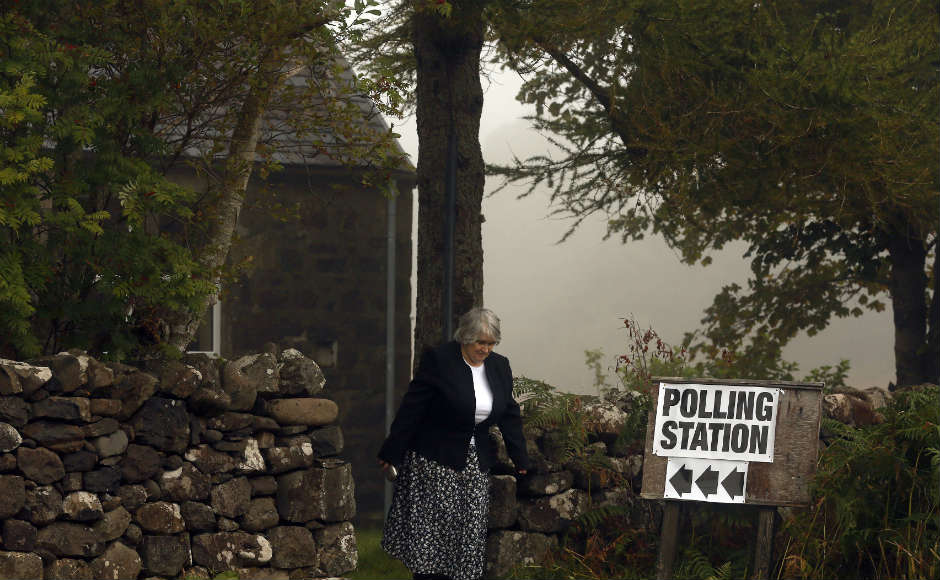 A voter arrives to cast her ballot at the Queen’s Cross parish church in Aberdeen, Scotland. Unlike polling stations in India, this one seems to have no long queues. Reuters