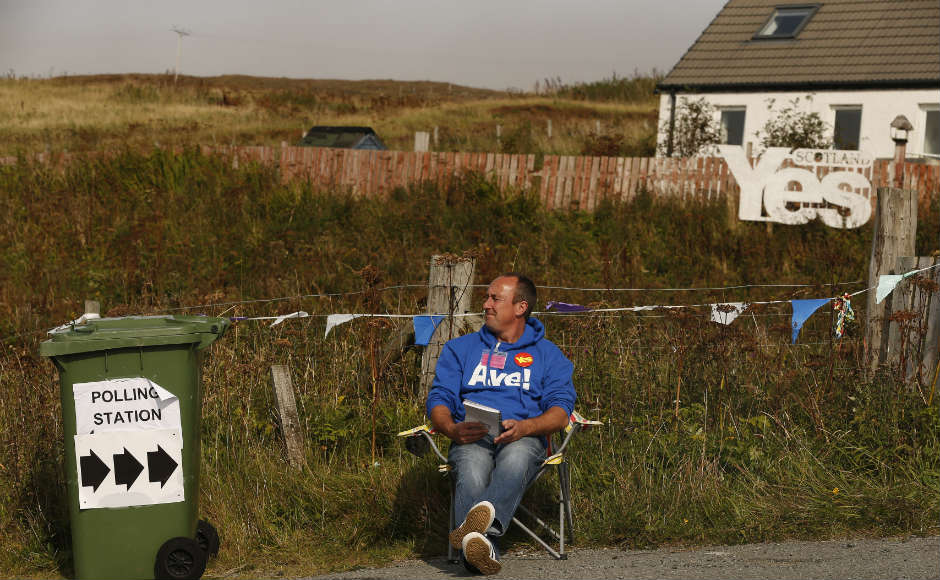 A ‘Yes’ campaigner sits outside the Waternish polling station on the Isle of Skye. Notice how the sky appears to be perfect here as well. Reuters