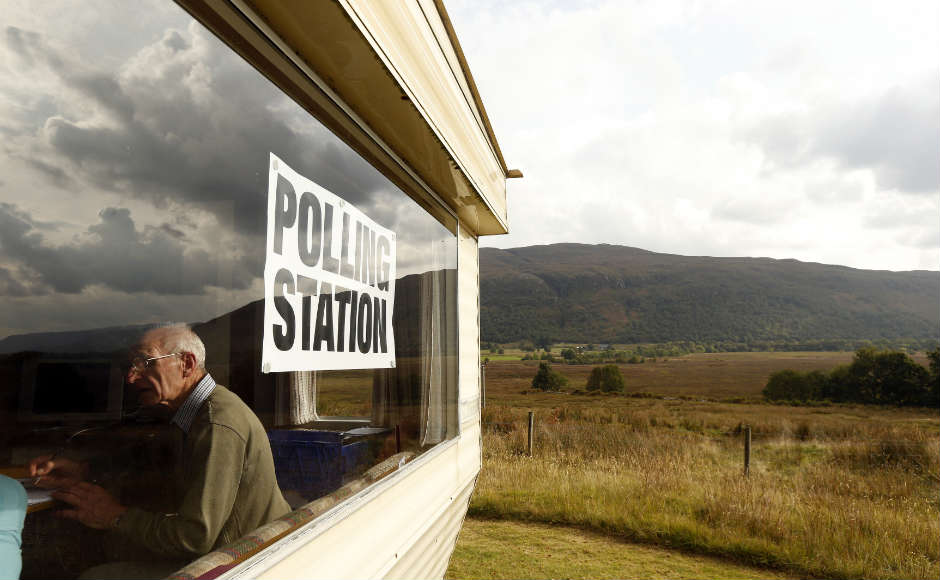 Poll clerk George MacKay sits in the Coulags caravan polling station, in the Scottish Highlands. Who wouldn’t want to go vote with a sky like that in the background. Reuters