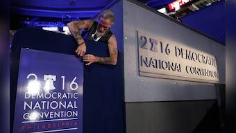 Seen through a reflection of the stage in a window, people stand in the seats during preparations for the DNC. The party announced Monday it would kick off its four-day spectacle with speeches from some of its most popular figures. Massachusetts Sen. Elizabeth Warren, a progressive favourite, would deliver the convention keynote. Sanders and First Lady Michelle Obama will also take the stage. AP
