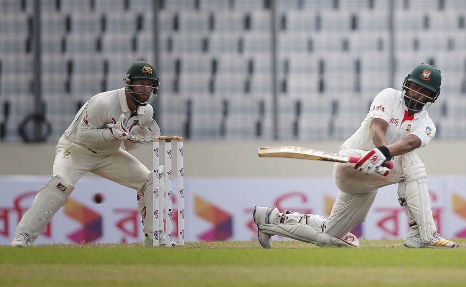 Matt Renshaw and Peter Handscomb resisted the Bangladesh spinners on a tricky wicket in a 69-run fifth-wicket stand and appeared to be settling in. But left-arm spinner Taijul Islam got a vital breakthrough with a ball that kept low and trapped Handscomb lbw. AP