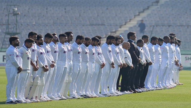 A moment of silence is marked by the Indian and Sri Lankan cricket teams for Australian cricketers Rod Marsh and Shane Warne, who recently passed away, ahead of the second day of the first test match between India and Sri Lanka in Mohali, India, Saturday, March 5, 2022. AP
