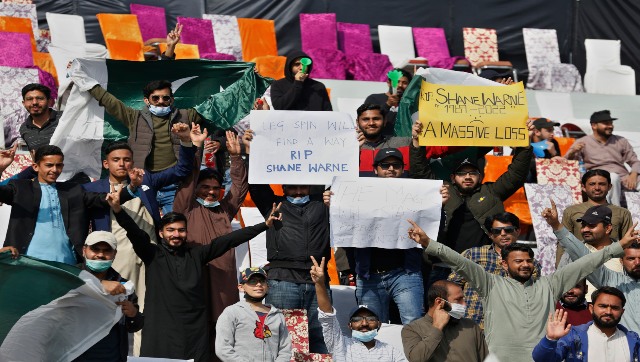 Cricket fans hold the placards to pay tribute Australian cricketer Shane Warne during the 2nd day of first cricket test match between Pakistan and Australia at the Pindi Stadium, in Rawalpindi, Pakistan, Saturday, March 5, 2022. (AP Photo/Anjum Naveed)