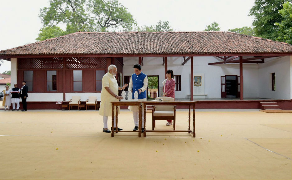 Dressed in a crimson Kurta, Abe, his wife and Modi then paid thier tributes to Mahatma Gandhi at the famed Sabarmati Ashram. PTI