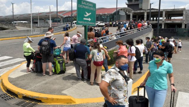Passengers line up outside the Juan Santa Maria international airport after a DHL cargo plane emergency landed there, in Alajuela, Costa Rica, on April 7, 2022. - The two crew members onboard the plane escaped unharmed. (Photo by Ezequiel BECERRA / AFP)