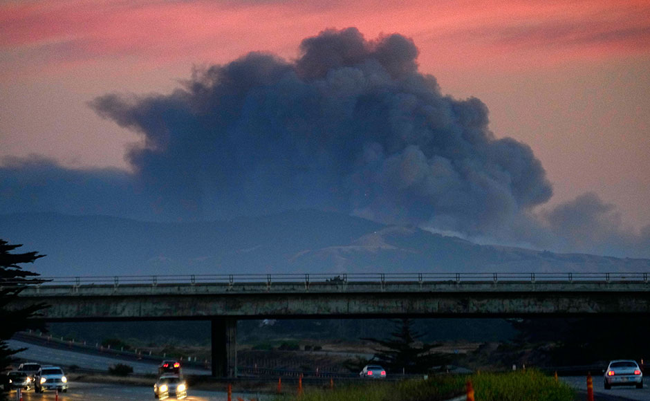 A large plume of smoke from a wildfire rises near Highway 1, burning five miles south of Carmel, California, on 22 July. AP