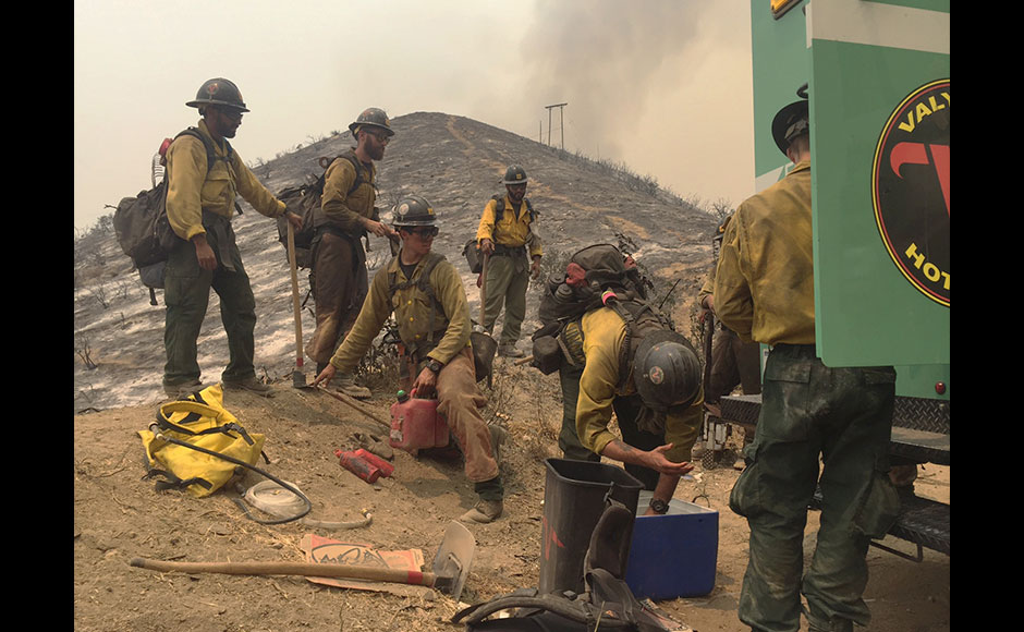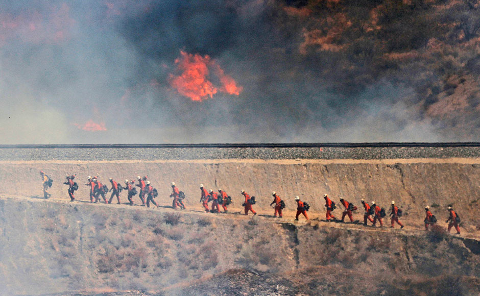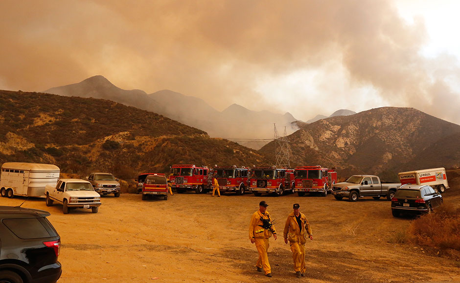 USDA Forest Service firefighters with the Valyermo Hotshots of Angeles National Forest prepare to head out again on Little Tujunga Canyon Road near the Wildlife Waystation in Santa Clarita, California.AP