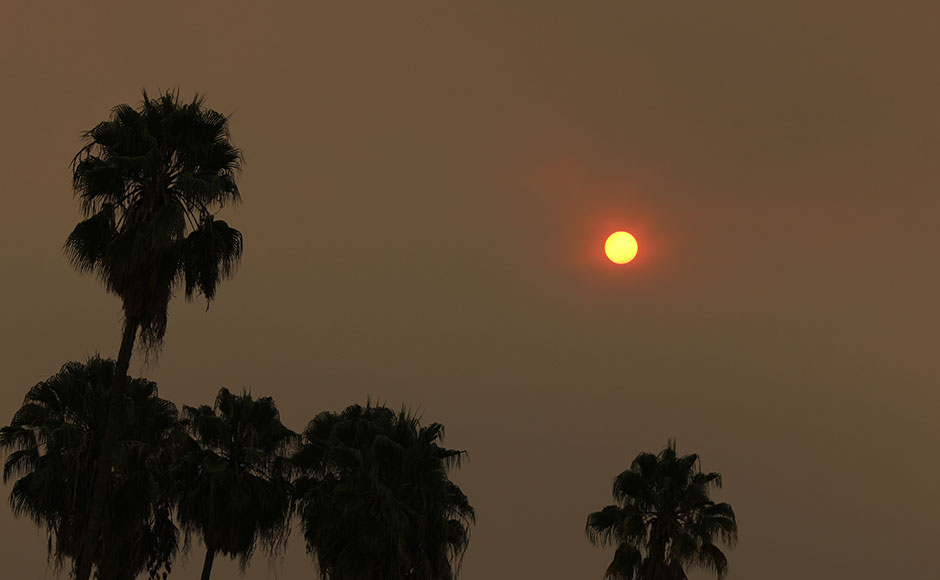 Smoke from a nearby wildfire is viewed from Monterey Park, California. Smoke drifted over downtown Los Angeles, about 30 miles from the fire’s location in Santa Clarita. It’s one of several blazes burning in Southern California as the region swelters under triple-digit heat. AP