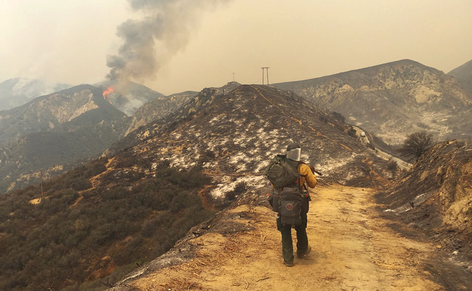 USDA Forest Service firefighter Simeon Hagens, with Angeles National Forest, packs out off of Little Tujunga Canyon Road in Santa Clarita. The fire in northern Los Angeles County darkened skies with smoke that spread across the city and suburbs, reducing the sun to an orange disk at times. The South Coast Air Quality Management District warned that at times air would reach unhealthy levels. The fire erupted Friday afternoon in the Sand Canyon area near State Route 14 as the region was gripped by high heat and very low humidity.AP