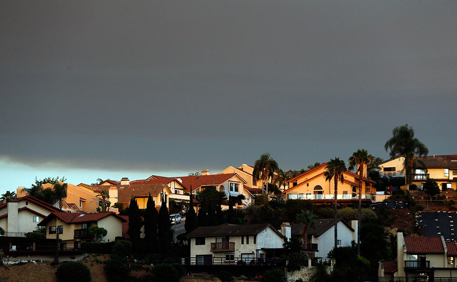 Skies darken as wildfire rises in the foothills near Los Angeles, California