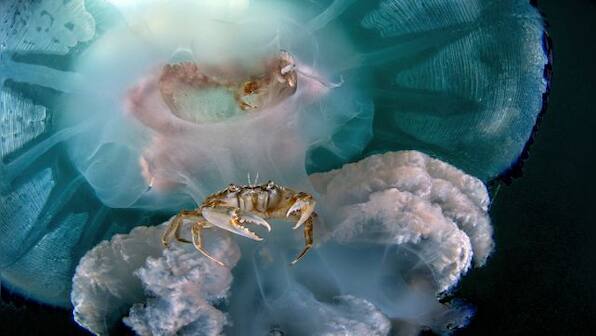 This photo was taken in the Mediterranean Sea, near Bacoli, which is located on the Gulf of Naples in Italy. A closer look at this jellyfish — Rhizostoma pulmo — known commonly as the barrel jellyfish, showed that there were crabs riding along with it. Image Courtesy: Salvatore Ianniello