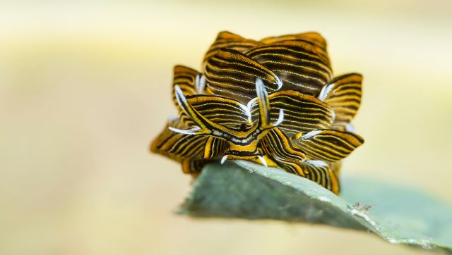 I found this tiny beauty while on a dive trip in Alotau, Papua New Guinea. It’s a butterfly sea slug (Cyerce nigra). It “stands” on the algae and scans the molecular composition of water. The creature’s body is only 15 mm long. I had to use a close-up wet lens in order to get closer to the model. The background wasn’t nice, but I saw a leaf on the seabed and put it behind the animal to make the picture more pleasing to the eye. Image Courtesy: Yury Ivanov