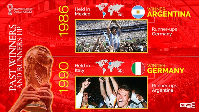 [caption id=“attachment_11566281” align=“alignnone” width=“640”]  Brazil have won the most number of FIFA World Cup titles with Germany and Italy right behind. Brazil’s last title came in the 2022 edition. Image: News18[/caption] [caption id=“attachment_11566291” align=“aligncenter” width=“640”]  Uruguay won the first-ever FIFA World Cup in 1930. Italy won the next edition, hosted by them, in 1934. Image: News18[/caption] [caption id=“attachment_11566301” align=“aligncenter” width=“640”]  Italy successfully defended their title in France in 1938 by beating Hungary 4-2. Both wins came under same coach (Vittorio Pozzo). The next World Cup took place in 1950 due to the disruption of World War II. In 1950, Uruguay won their second title by triumphing in Brazil. It was the first time the trophy was referred to as the Jules Rimet Cup, in honour of the FIFA president. Image: News18[/caption] [caption id=“attachment_11566311” align=“aligncenter” width=“640”]  1954 World Cup was won by West Germany, for their first title, by beating Hungary 3-2 in the final. A jaw-dropping 5.38 goals were scored per game. In 1958, Brazil won their first title, beating hosts Sweden 5-2 in the final. The tournament saw the arrival of 17-year-old Pele on the scene. Image: News18[/caption] [caption id=“attachment_11566321” align=“aligncenter” width=“640”]  Brazil won their second straight title at the 1962 World Cup beating Czechoslovakia 3-1 in the final in Chile. They were the last team to win consecutive trophies. England won their first, and so far only, World Cup in 1966 when they were the hosts. England beat West Germany 4-2 in the final with two goals coming in extra time. Image: News18[/caption] [caption id=“attachment_11566331” align=“aligncenter” width=“640”]  At the first World Cup held outside Europe and South America, Mexico played host to the 1970 edition where Brazil won for the third time beating Italy 4-1 in the final. With Brazil winning a third title, they got to permanently keep the Jules Rimet Trophy and a new one was introduced for 1974. The 1974 World Cup witnessed the first appearance of the current styleSouth [/caption] [caption id=“attachment_11566341” align=“aligncenter” width=“640”]  1978 World Cup was once again won by a host nation with Argentina triumphing for the first time. They beat Netherlands 3-1 in the final. The next tournament, hosted by Spain in 1982, had Italy winning their third title with West Germany finishing second. It was the first tournament with a penalty shoot-out. Image: News18[/caption] [caption id=“attachment_11566351” align=“aligncenter” width=“640”]  At the 1986 World Cup, held in Mexico, Argentina beat West Germany in the final for their second trophy. The tournament is distinctly remembered for Diego Maradona scoring the “Goal of the Century” and “Hand of God” in the same game against England. West Germany won the next edition, hosted by Italy in 1990, by beating Argentina 1-0. This was the last tournament to feature a team from West Germany after the unification with East Germany. Soviet Union and Czechoslovakia also made their last appearances. Image: News18[/caption] [caption id=“attachment_11566361” align=“aligncenter” width=“640”]  Football breached the American shores for the 1994 World Cup. The tournament witnessed large attendance across the venues with Brazil winning their fourth title in front of a packed Rose Bowl, Pasadena crowd. It was the first World Cup to be decided on penalties. At the last tournament of the millennium, France won their first title in front of their home crowd. France beat Brazil 3-0 at the Stade de France in Paris in the final. Image: News18[/caption] [caption id=“attachment_11566371” align=“aligncenter” width=“640”]  2002 was the first World Cup to be held in Asia and the first to be jointly-hosted (Japan and South Korea). Brazil beat Germany 2-0 in the final for their fifth title. The tournament is remembered for shoddy refereeing in South Korea’s run to the semis. The 2006 World Cup was played in Germany with Italy beating France in the final. Italy’s fourth title came courtesy a moment of madness in which Zinedine Zidane headbutted Marco Materazzi. Image: News18[/caption] [caption id=“attachment_11566381” align=“aligncenter” width=“640”]  In 2010, South Africa became the first African hosts of the FIFA World Cup. Spain won their first title by beating Netherlands 1-0 in extra time. Vuvuzela became popular courtesy the World Cup in South Africa. The 2014 World Cup was held in Brazil and was won by Germany for a fourth title. They beat Argentina 1-0 in extra time. in the final. Brazil suffered a depressing 7-1 defeat to Germany. Image: News18[/caption] [caption id=“attachment_11566391” align=“aligncenter” width=“640”]  Russia hosted the first FIFA World Cup in Eastern Europe. Before being upstaged by the upcoming World Cup in Qatar, it was the most expensive tournament. France won their second title, beating Croatia 4-2 in the final. Kylian Mbappe announced himself to the stage at the tournament. Image: News18[/caption]
