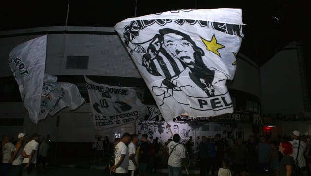 Fans wave flags with the image of the late Brazilian football star Pele outside the Vila Belmiro stadium, home of the Santos FC soccer club, in Santos, Brazil, Thursday, Dec. 29, 2022. (AP Photo/Fabricio Costa)[/caption] [caption id=“attachment_11903061” align=“alignnone” width=“640”]