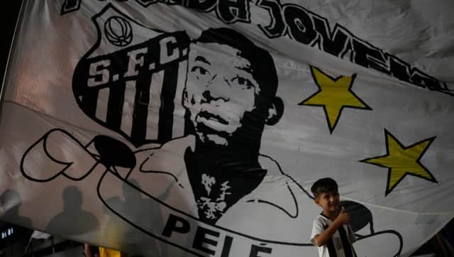 A boy poses in front of a flag of the late Brazilian football star Pele outside the Vila Belmiro stadium, home of the Santos FC soccer club, in Santos, Brazil, Thursday, Dec. 29, 2022. (AP Photo/Matias Delacroix)[/caption] [caption id=“attachment_11903071” align=“alignnone” width=“640”]