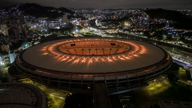 The Maracana Stadium is illuminated in yellow, one of the colors of the Brazilian national flag, to honor late football legend Pele, in Rio de Janeiro, Brazil, Thursday, Dec. 29, 2022, Edson Arantes do Nascimento, known as Pele has died in Sao Paulo. He was 82. (AP Photo/BrunaPrado)[/caption]