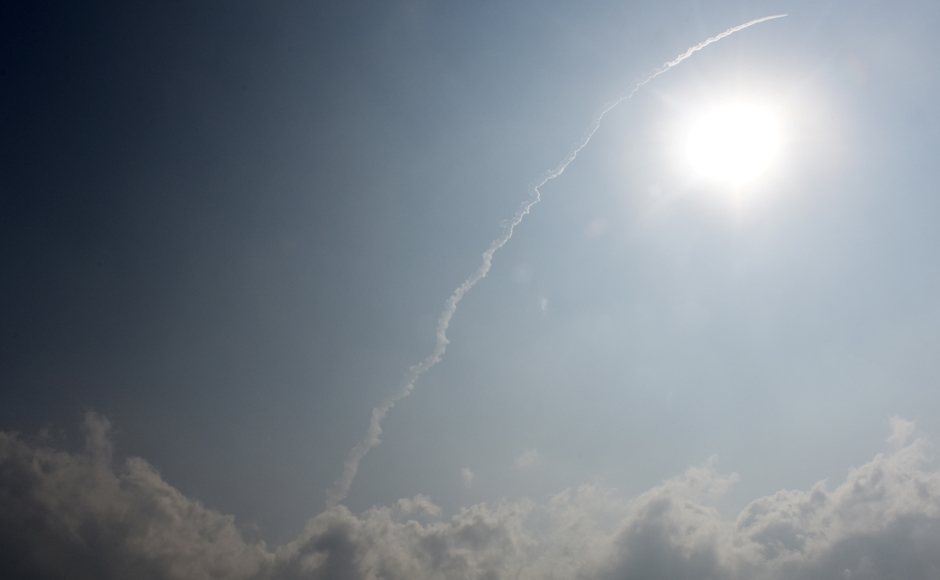 The Indian Space Research Organisation (ISRO) Polar Satellite Launch Vehicle (PSLV-C37) is seen after launch at Sriharikota on Wednesday. India successfully put a record 104 satellites from a single rocket into orbit on 15 February in the latest triumph for its famously frugal space agency. AFP