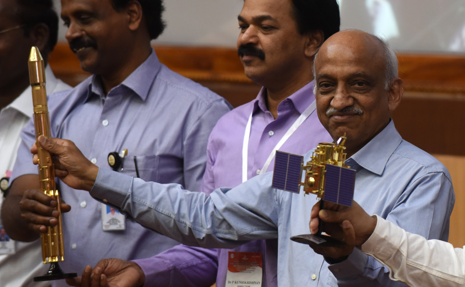 Indian Space Research Organisation (ISRO) chairman Kiran Kumar Rao (R) displays models of the CARTOSAT-2 and Polar Satellite Launch Vehicle (PSLV-C37) as he speaks to media after the launch of the Polar Satellite Launch Vehicle (PSLV-C37) at Sriharikota on Wednesday. AFP