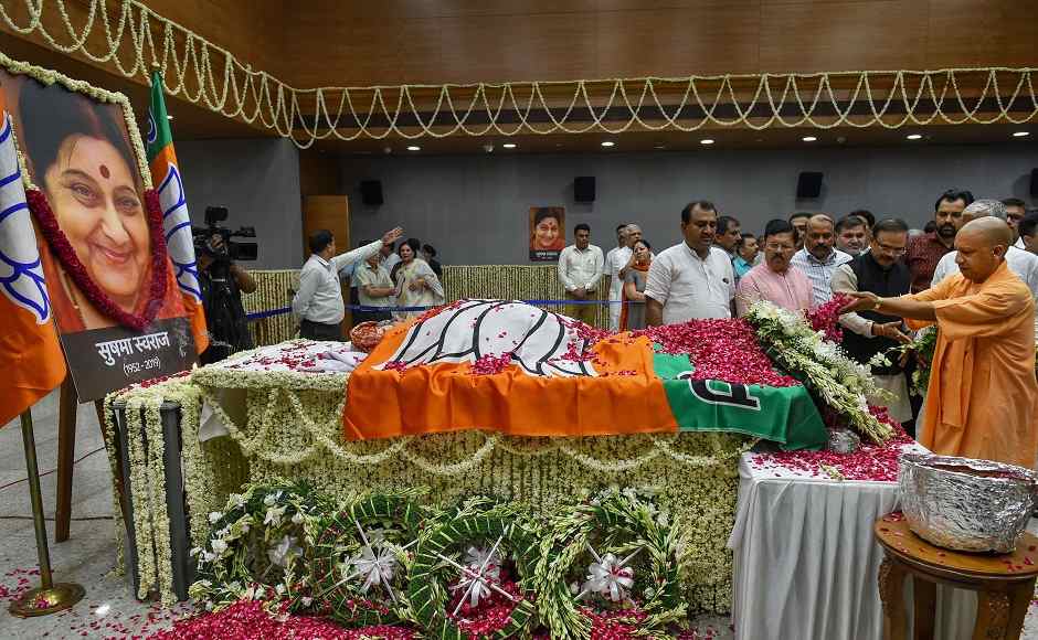 Uttar Pradesh chief minister Yogi Adityanath paid floral tribute to former external affairs minister Sushma Swaraj at the BJP headquarters. PTI