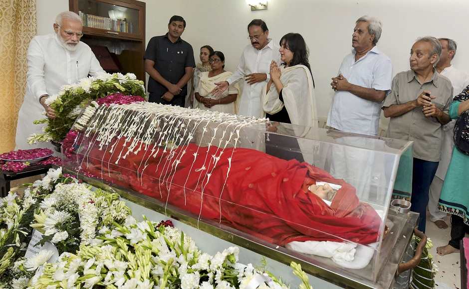 Prime Minister Narendra Modi, Vice-President Venkaiah Naidu, Home Minister Amit Shah and Defence Minister Rajnath Singh were among the top dignitaries who laid wreath to pay their final respects at Lodhi crematorium. PIB