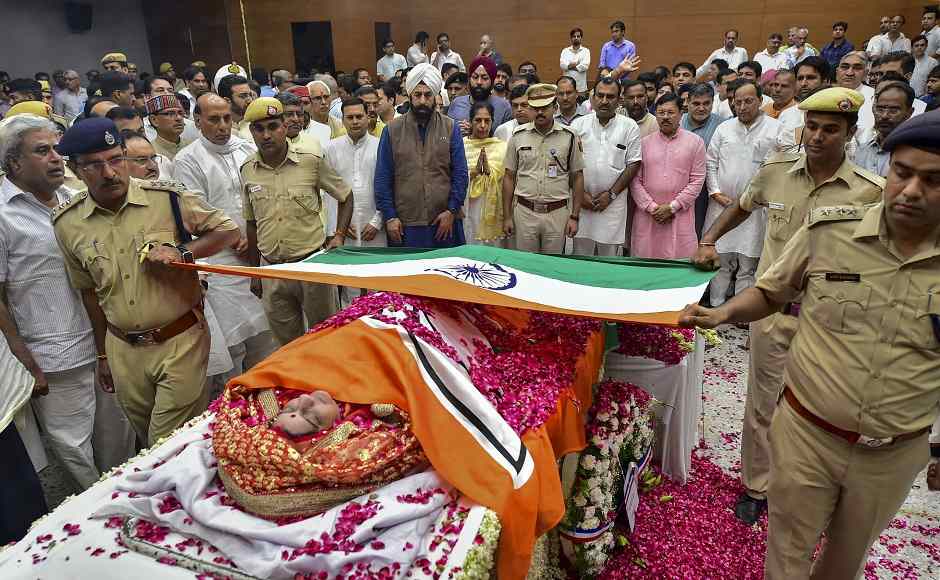 Home Minister Amit Shah honored the departed leader by laying the BJP flag over her mortal remains at the BJP headquarters. PTI