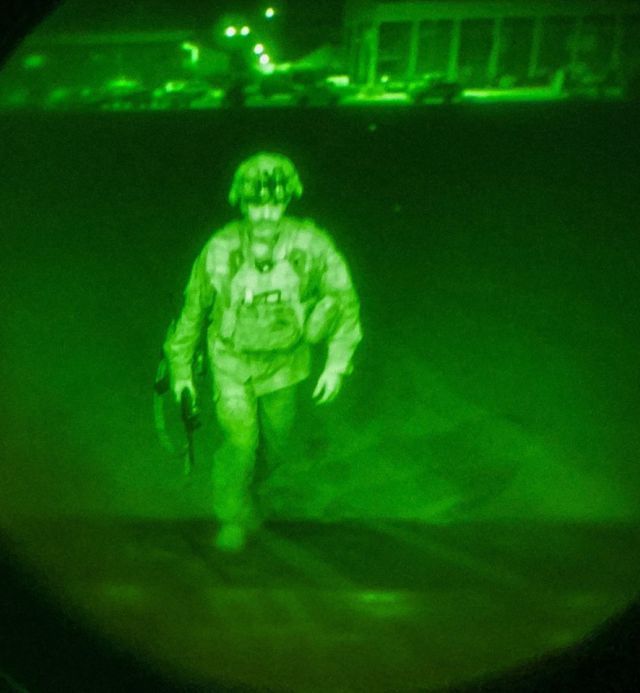 This image tweeted by the US Central Command shows Major General Chris Donahue, commander of the US Army 82nd Airborne Division, XVIII Airborne Corps, boarding a C-17 cargo plane. Major General Donahue became the final American service member to depart Afghanistan; his departure closes the US mission to evacuate American citizens, Afghan Special Immigrant Visa applicants, and vulnerable Afghans. Image Credit: US Central Command/AFP