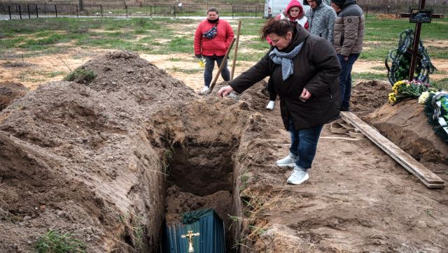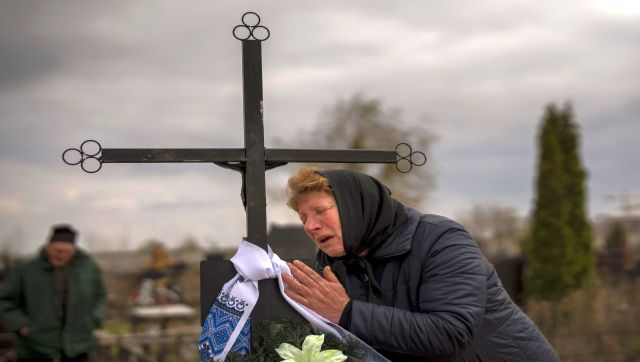 Galyna Bondar mourns next to the grave of her son Oleksandr, 32, after burying him at the cemetery in Bucha, in the outskirts of Kyiv, Ukraine. AP