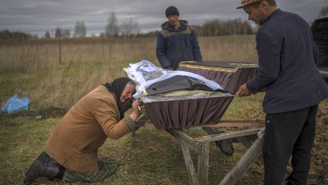 Coffins being buried during a funeral ceremony at a cemetery in Bucha, Ukraine. In Bucha, Ukrainian forces have buried hundreds of people in a mass grave. Mayor Anatoly Fedoruk had said that at least 280 people had already been laid to rest in these mass graves. AFP