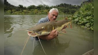 Host of the show Jeremy Wade holding a red-tailed catfish on the Araguaia River, one of the major rivers of Brazil. He has spent twenty-five years exploring the world's remotest rivers and lakes. Animal Planet